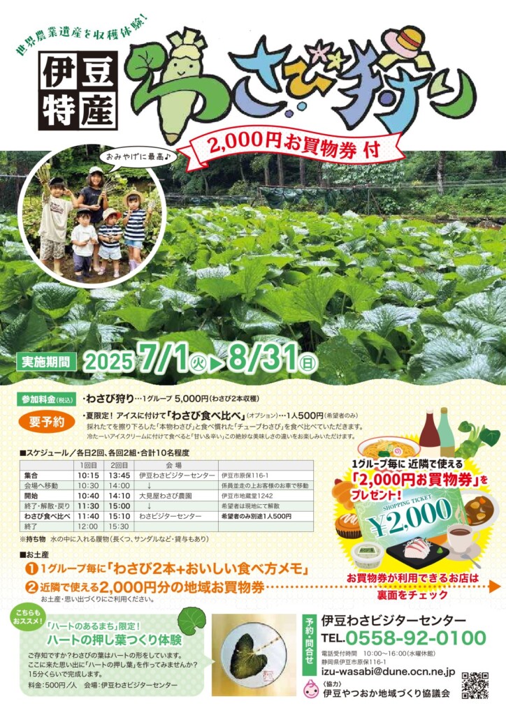 伊豆わさビジターセンターでは、冷たい空気と水で育ったわさびを自分の手で収穫できる期間限定のイベントを開催します。1グループ毎にわさび2本収穫し、お土産には「わさび2本+おいしい食べ方メモ」「近隣で使える2,000円分の地域お買物券」がもらえます!