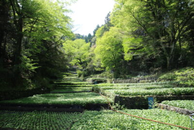 伊豆市の天城山系は年間雨量が3,000㎜~4,000㎜で、日本有数の多雨地帯です。この豊富な雨は、湧水となって伊豆の水わさびを育てています。畳石式のわさび田の美しい景観や、豊かな生態系、巧みな栽培技術は、日本農業遺産にも登録されています。水わさびの栽培面積は、本地域が日本一で、水わさび栽培の歴史は250年以上ともいわれています。本地域で栽培した水わさびは品質が高く、根茎は「伊豆わさび」としてJA伊豆の国などを通じて広く市場に流通しています。
