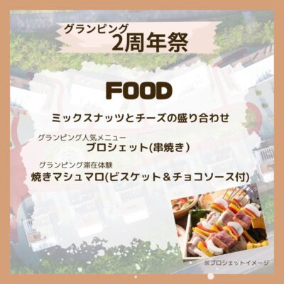 グランピングで人気のある、ブロシェット(串焼き)や焼きマシュマロの販売も。そしてワインはもちろんビールやカクテル、ソフトドリンクなどもお愉しみいただけます。