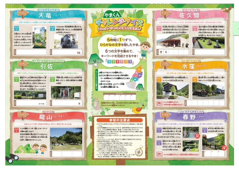さらに、6エリアをすべて巡ってキーワードを集める「やまくんチャレンジクイズ」正解者の中から抽選で1名様に、「山のスペシャル宝箱」が当たります。