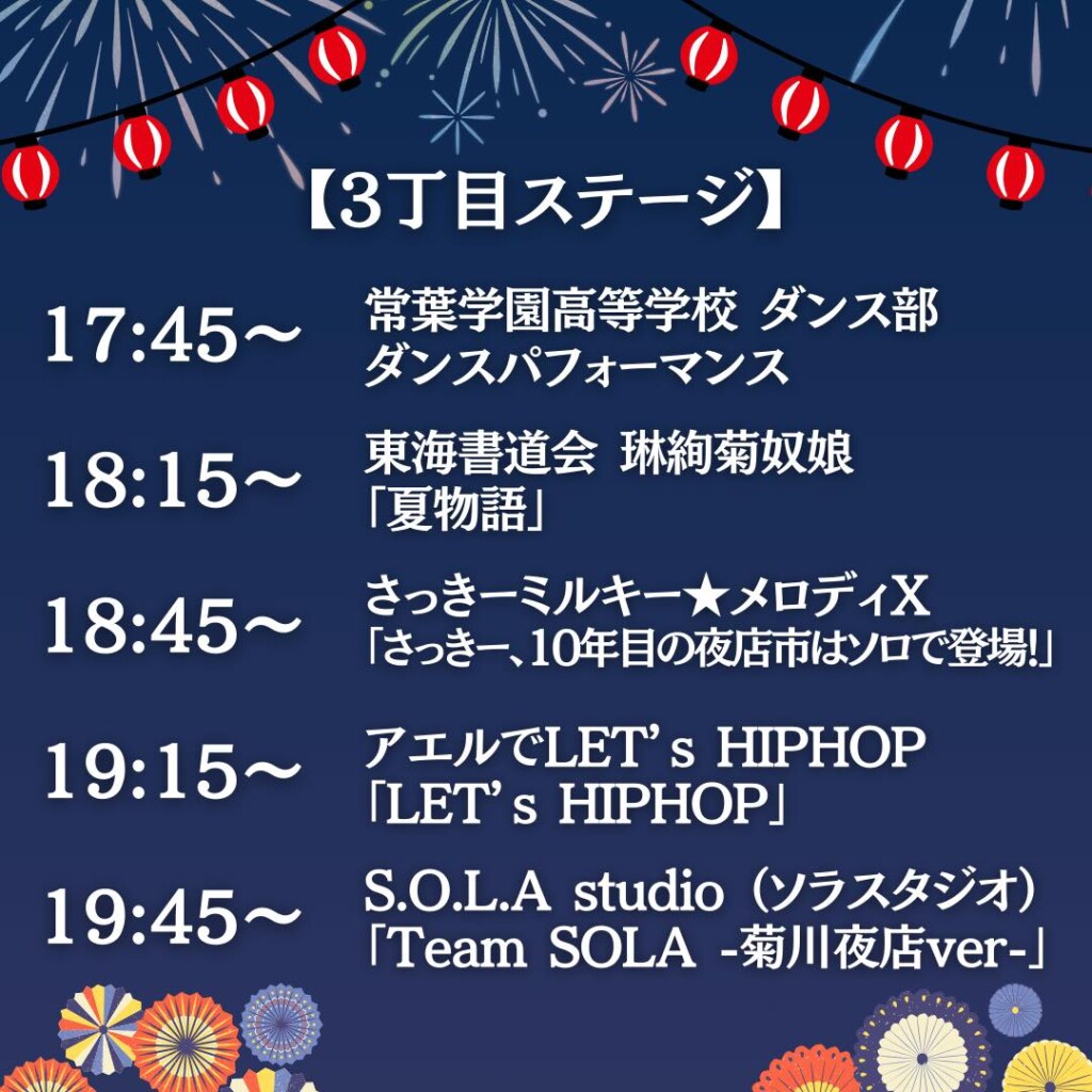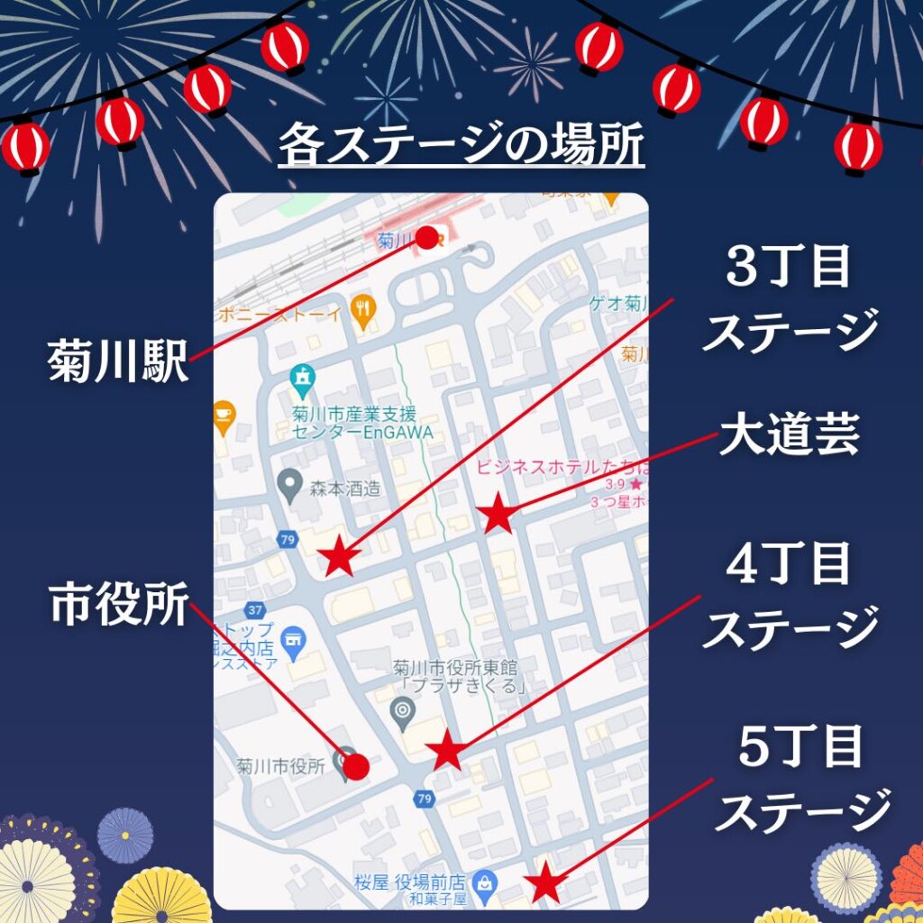約90軒もの出店が並び、金魚すくいやヨーヨー釣りをはじめ、地域の名産品を販売するほか、通りの各所に設けられたステージでは、歌や踊りのパフォーマンスや書道など様々なパフォーマンスが繰り広げられます。フィナーレでは「きくはなび」の打ち上げを行います。是非遊びに来てください!!