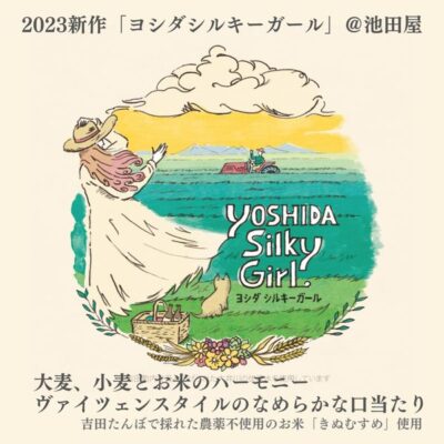 今年の新作で、池田屋麦酒さんにお願いしたヴァイツェンタイプのビールです。小麦とお米を副原料に入れることでシルキーで、上品な口当たりに仕上げてあります。お米は吉田たんぼで採れた農薬不使用の「きぬむすめ」を使用。