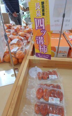長泉町産直市では、渋抜きされた四ッ溝柿と四ッ溝柿の干し柿が並んでいました。