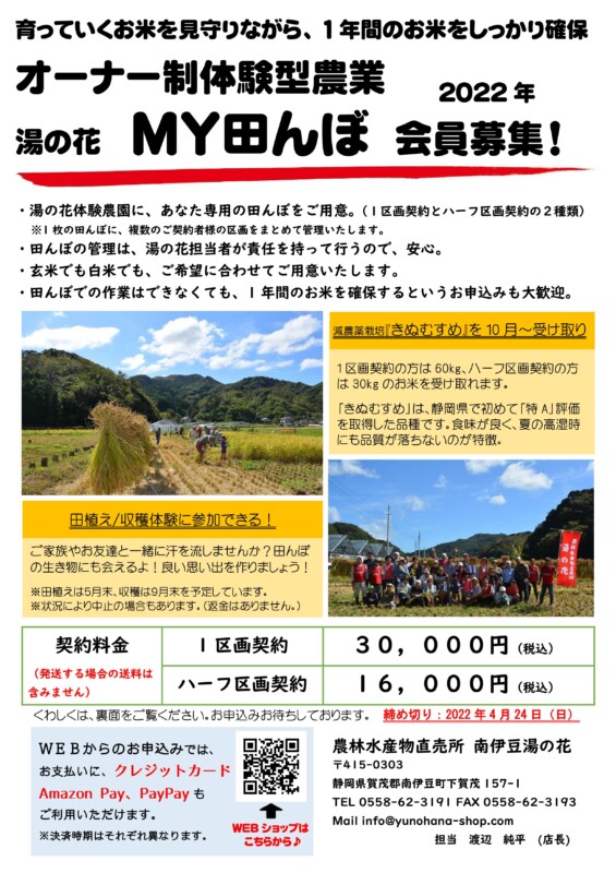 農林水産物直売所 南伊豆湯の花では、「湯の花MY田んぼ2022」会員募集を始めました。