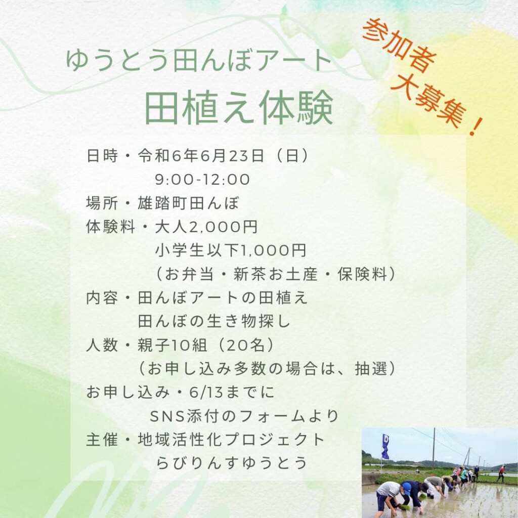 ふじのくに美しく品格のある邑でもあります “らびりんすゆうとう” さんの「ゆうとう田んぼアート」が今年も行われます。6月は田植えの季節です。自然を感じながら、親子で楽しく田植え体験をしてみませんか??ぜひこの機会に参加をしてみて下さい!!