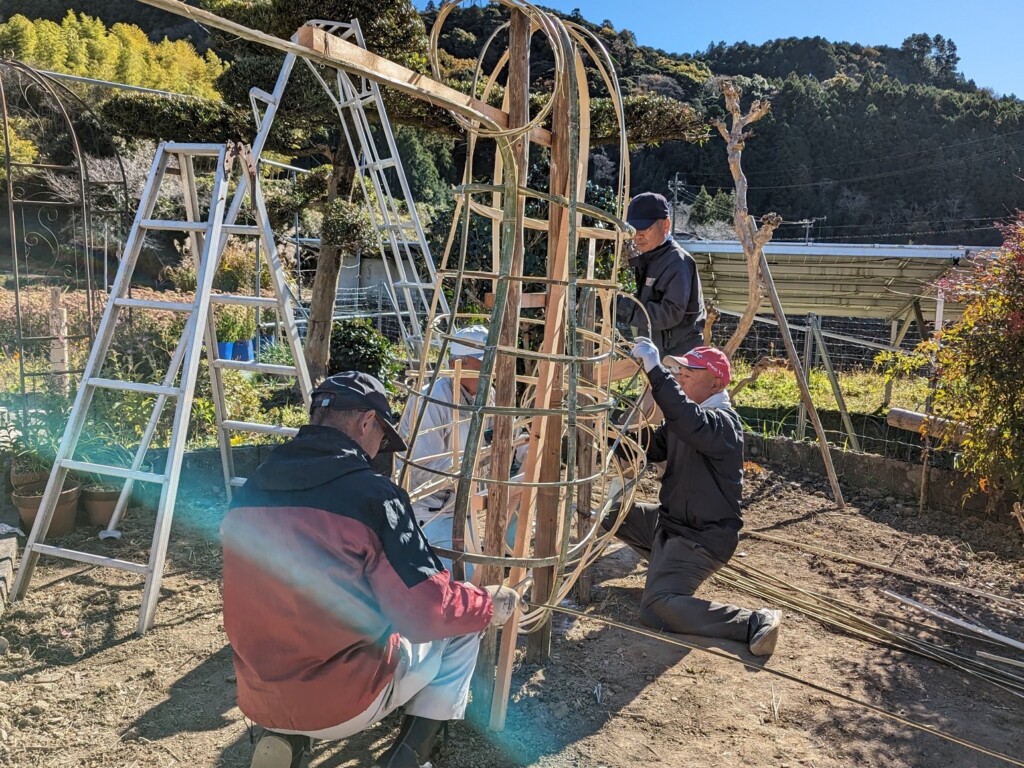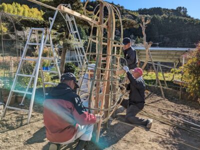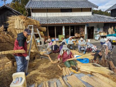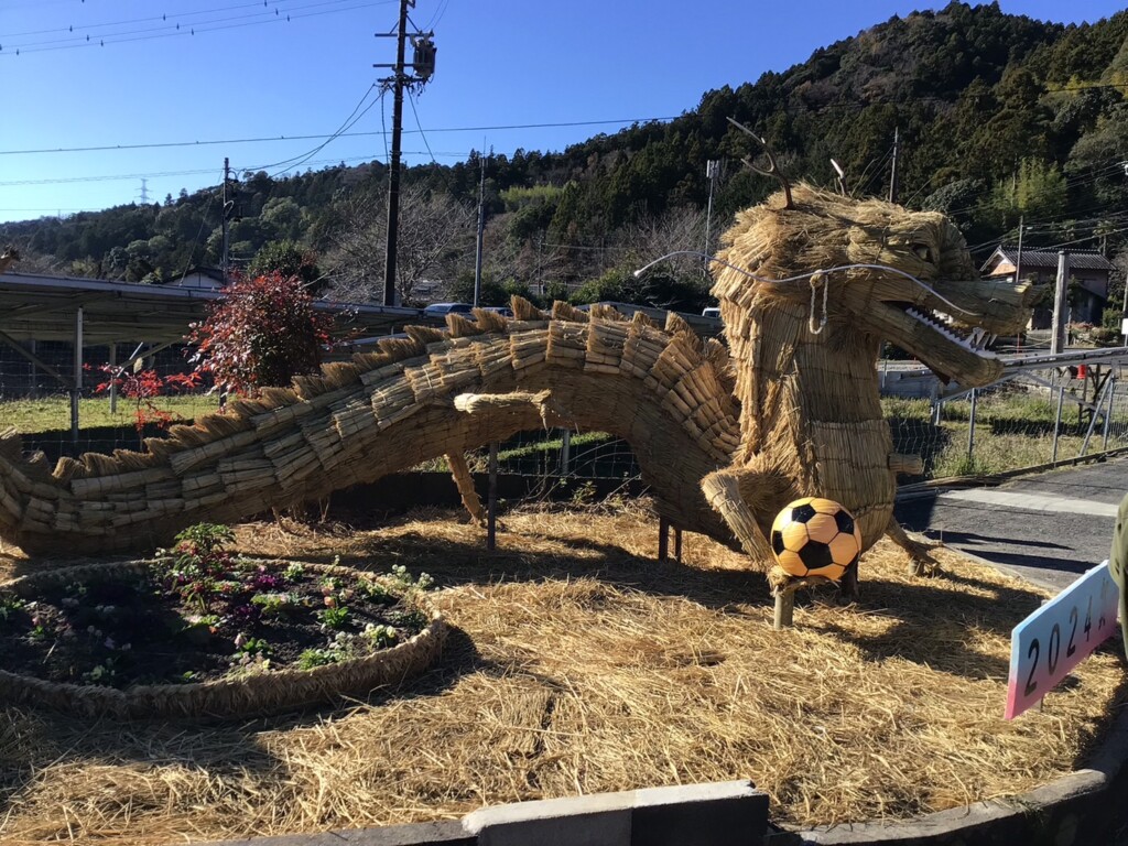 オブジェは、骨格を竹で組み、軽トラ3杯分のわらを使って、角や爪はシカの角を使用しているそうです。メンバーや住民約30名が参加して造った自慢のアレ(オブジェ)が出来上がりました。