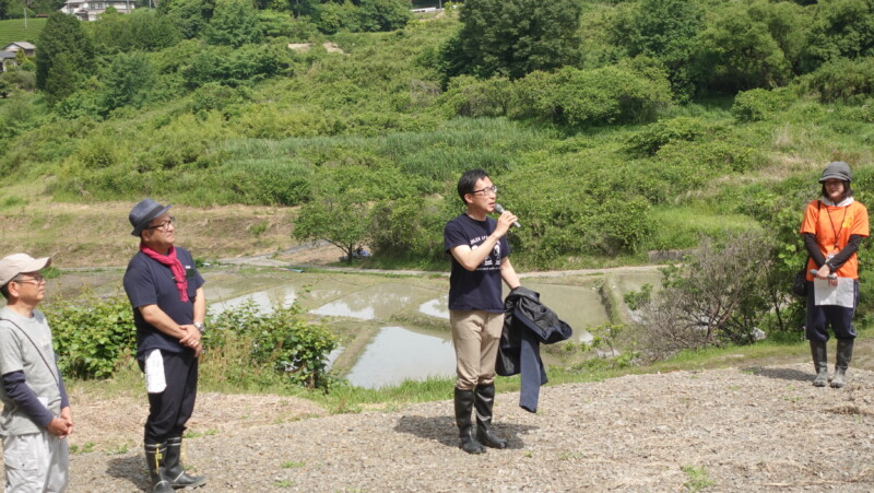 オーナー田植え初日の開会式には、NPO法人せんがまち棚田倶楽部の山本理事長の主催者あいさつ、菊川市長はじめ衆議院議員、県議会議員の来賓あいさつがありました。