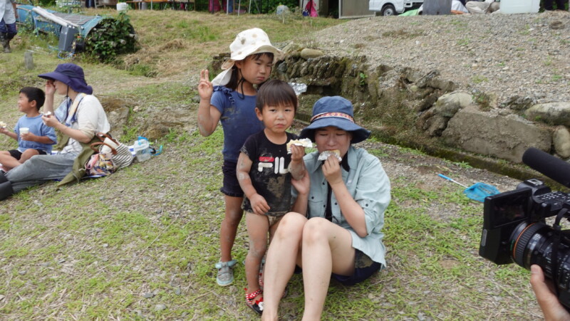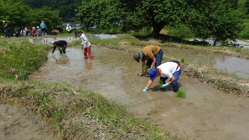 大人から子どもまで田んぼの中で悪戦苦闘しながら、泥だらけになって楽しく田植えをしていました。