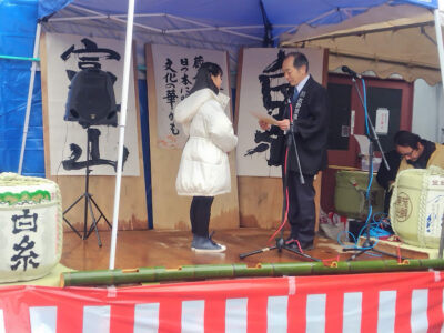 樽酒の横に募金BOXが用意され、協力者には樽酒が振る舞われていました。