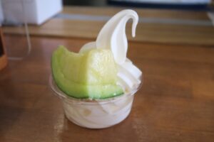 メロンはとってもジューシーで甘く、メロンだけで食べてもソフトクリームと一緒に食べても美味しかったです!