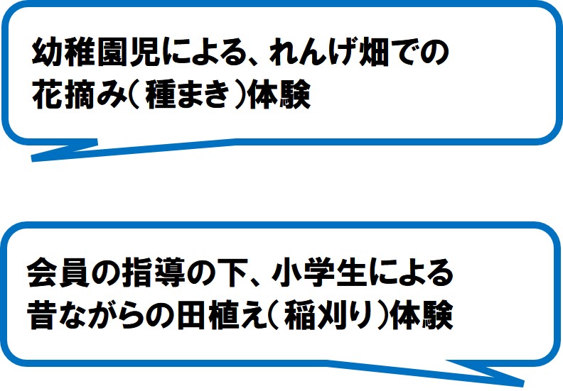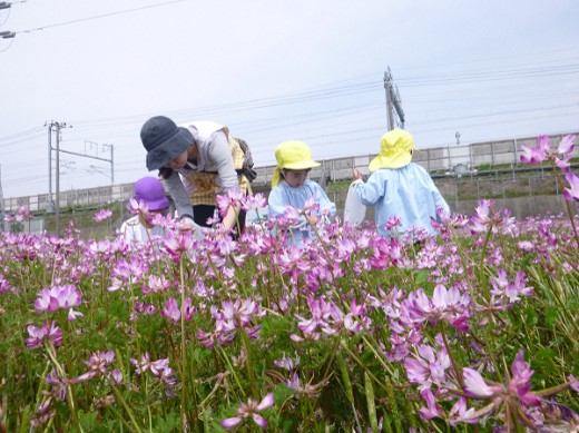 この景観形成のために、農道や排水路の草刈り、また田んぼへのれんげの種まきを地元の人たちを交えて会員が積極的に行っています。