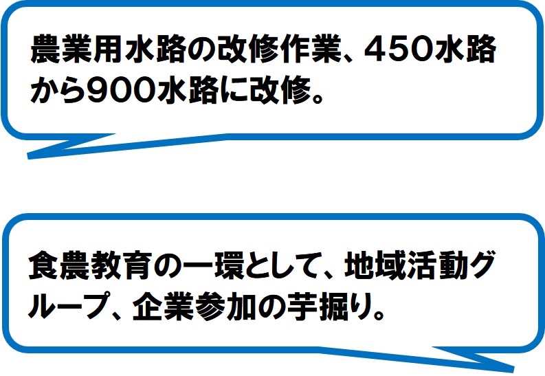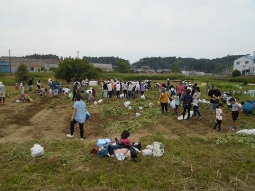 写真②は、今年度地域企業の従業員と海外からの研修生、地域活動グループ(ぴかっと倉真)によるじゃがいも掘りの様子です。