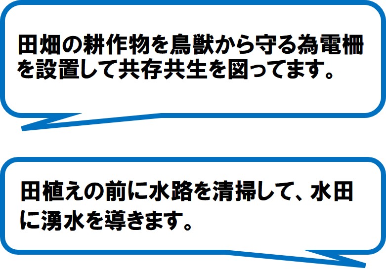 30~70代のメンバー30名ほどで邑の水田、農道や水路の整備保全を行うとともに、近年多発している鳥獣害の被害から地域の田畑を守るため、電柵の設置と管理活動を通して、豊かな邑の里山を後世に繋ぎ残すための活動をしています。