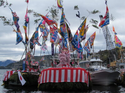 沼津市西浦で毎年4月4日に開催される「大瀬まつり」は、駿河湾の漁民の信仰を一身に集める大瀬神社の例祭です。 この祭りの最大の見どころは、長襦袢をまとい、顔を白塗りにした青年達が、華やかに飾り付けられた漁船の上で繰り広げる「勇み踊り」。女装した青年達が「勇み踊り」を「チャンチャラオカシ」のお囃子に合わせて賑やかに踊るところから、「天下の奇祭」とも称されています。踊り船が岸壁に到着すると、青年達は大漁と航海の安全を願って大瀬神社に参拝します。