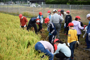 収穫されたお米は、学校で食べたり、牧之原市の小学生が考案した地域食材を使った料理の出来栄えを競う「アースランチフェスティバル」で使用します。同時に作っていた餅米は餅つきをして全校児童でいただくそう。