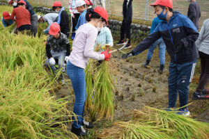 まず子どもたちはカマを使って稲刈りの体験。今やカマを使う機会はほとんどないですが、クラスのみんなで田んぼの一角・10平米ほどの大きさを15分近くかけて刈り取っていました。しかし、このまま続けても400平米の田んぼを全部刈るには日が暮れるどころか、何日もかかってしまいます。そこで、文明の利器・コンバインの登場! 先程子どもたちが15分かけて一生懸命刈った面積はコンバインを使えば数十秒。乗車体験もさせてもらい、ザクザクと刈って行く様子を上から見学しました。