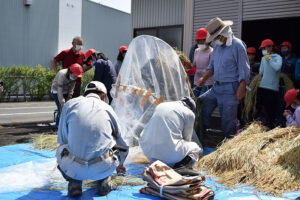 子ども達は「足踏み脱穀機」を使って脱穀体験。先程はコンバインが一瞬で脱穀しましたが、足踏み脱穀機はペダルを踏んで円筒形のこぎ胴を回転させ、稲の束を押し付けて穂を落とすという仕組み。回転する方向のコントロールが難しかったり、稲の束が多すぎると引っかかって止まってしまったりと四苦八苦していたようでしたが、会のみなさんの協力のもと無事予定していた稲の脱穀をし終えました。