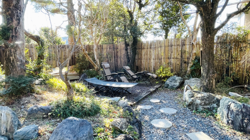 木陰に設置されたリクライニングチェアを使って外気浴も楽しめます。風にそよぐ木々を見ていると、時間の流れをうっかり忘れてそうなほど。のどかでゆったりとした癒やしの時を過ごせます。