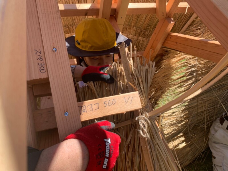 シート状に組まれたわらを、木の骨組みに取り付け、